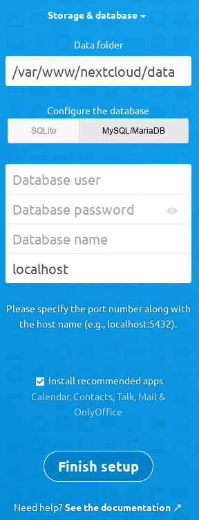 When Nextcloud prerequisites are fulfilled and all Nextcloud files are installed, the last step to completing the installation is running the Installation Wizard. This is just three steps: