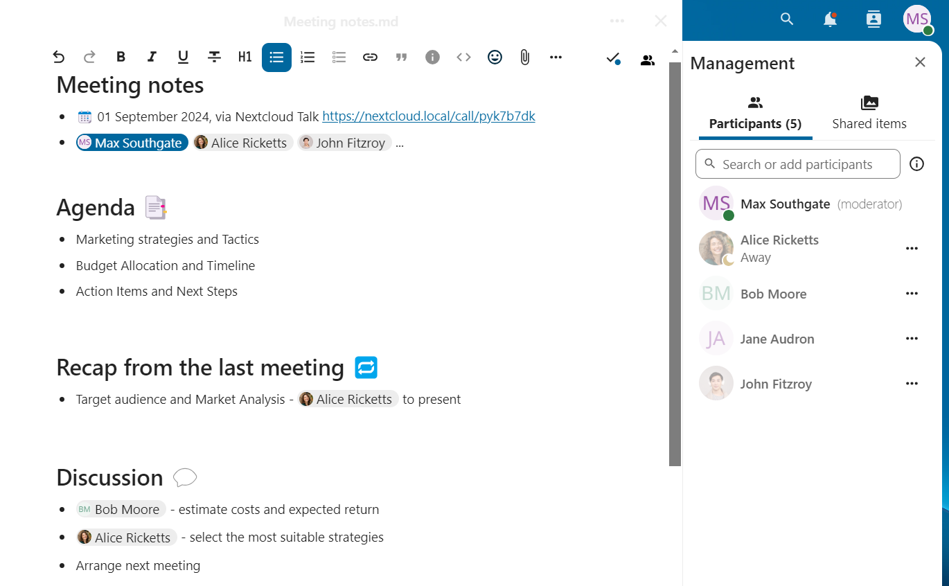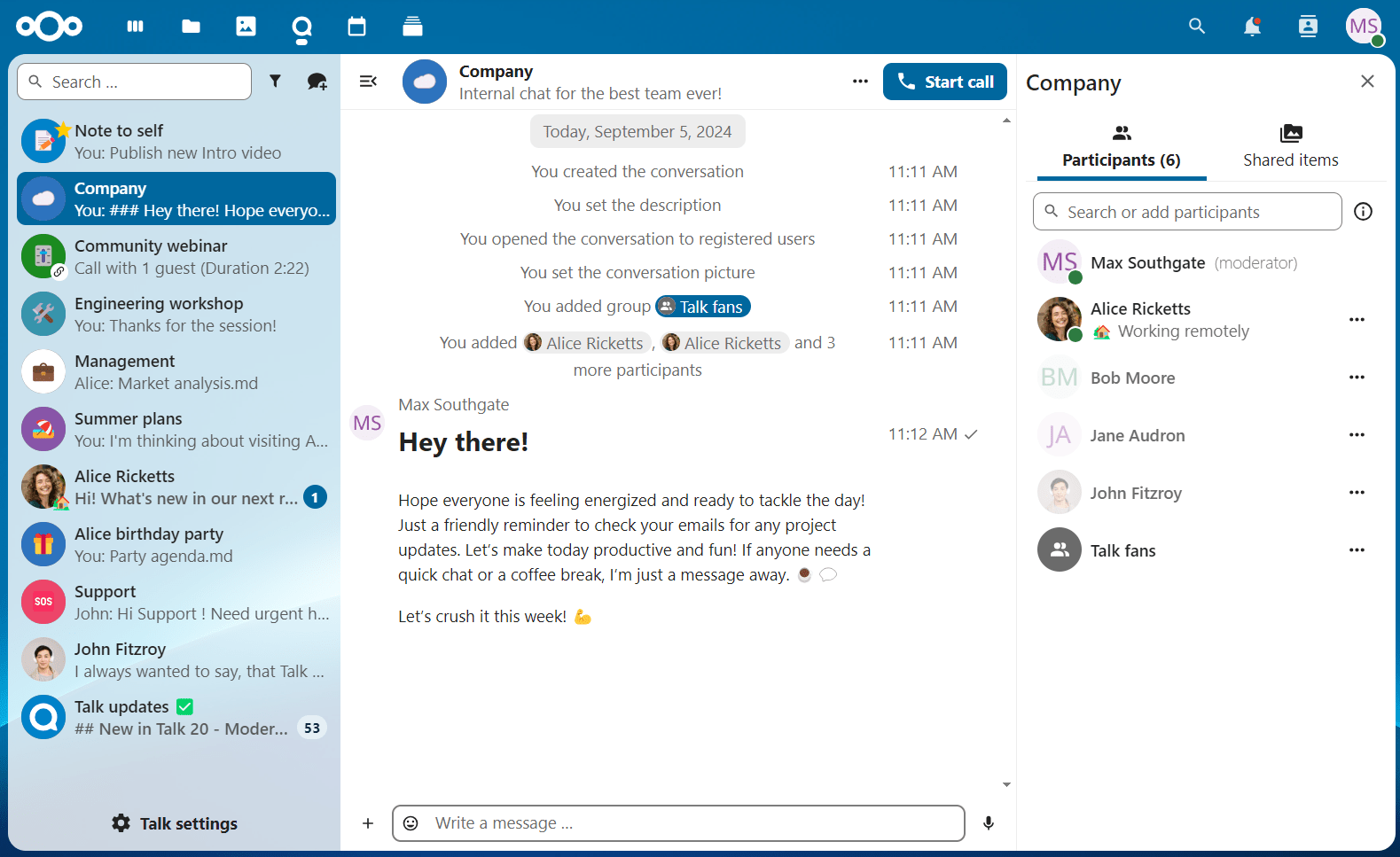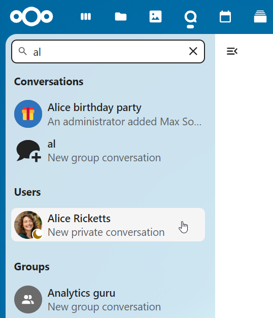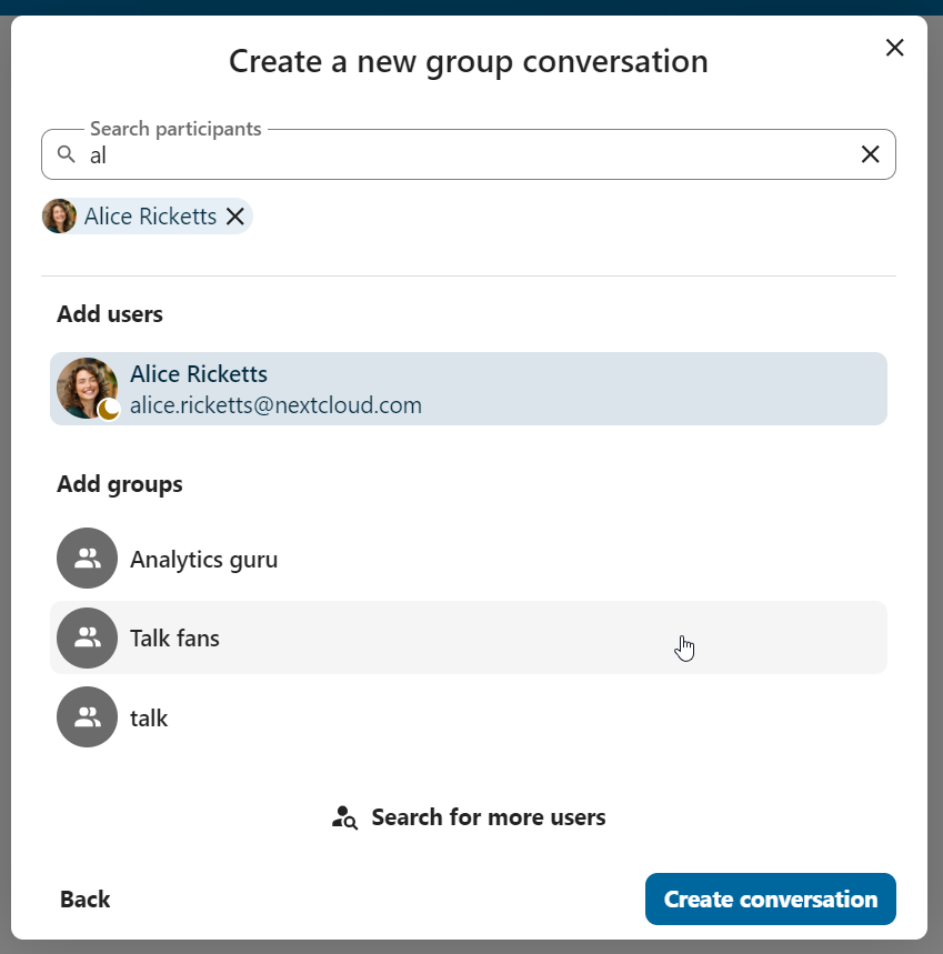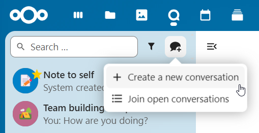 Group conversations. Besides the person who created the conversation, a group conversation can have any number of people in it. A group conversation can be shared publicly with a link, so external guest users can join a call. It can also be listed, so other people on your Nextcloud server can join the conversation.