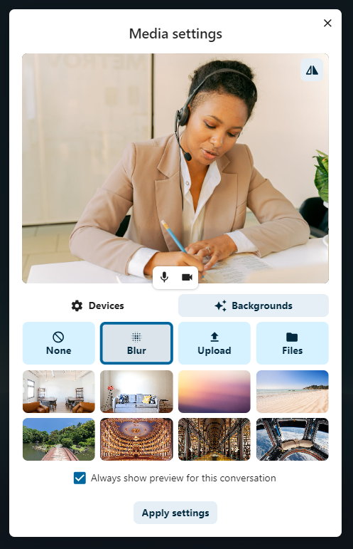 You can access your settings and choose a different webcam, microphone and other settings in the ... menu in the top bar.